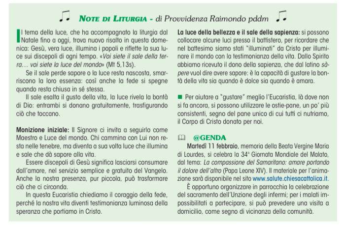 Il tema della luce, che ha accompagnato la liturgia dal Natale fino a oggi, trova nuovo risalto in questa domenica: Gesù, vera luce, illumina i popoli e riflette la sua luce sui discepoli di ogni tempo. «Voi siete il sale della terra… voi siete la luce del mondo» (Mt 5,13s). Se il sale perde sapore o la luce resta nascosta, smarriscono la loro essenza: così anche la fede si spegne quando resta chiusa in sé stessa. Il sale esalta il gusto della vita, la luce rivela la bontà di Dio: entrambi si donano gratuitamente, trasfigurando ciò che toccano.